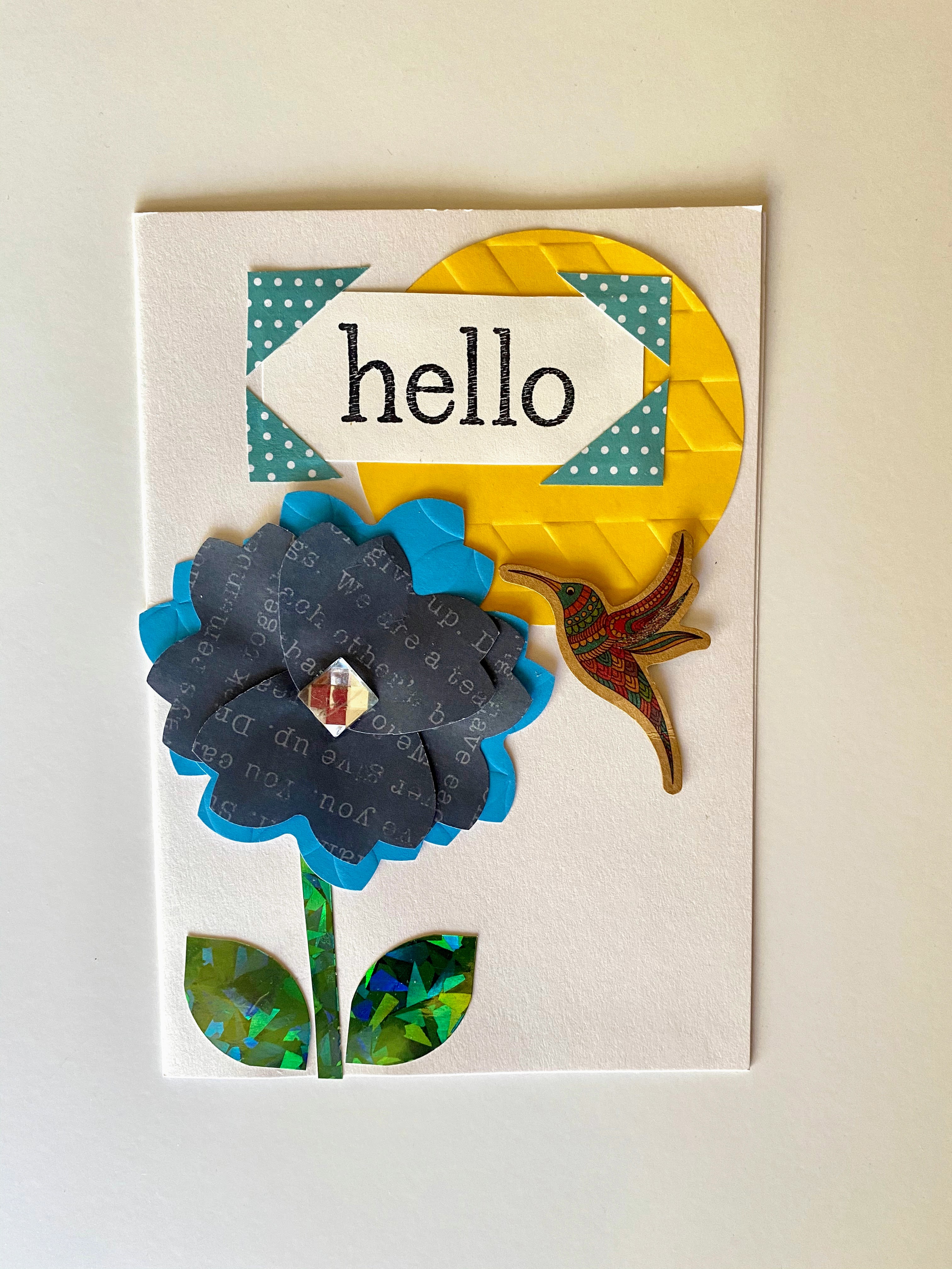 Using a large circle paper punch, we cut out a sun from a brightly yellow embossed paper. We found an old hummingbird sticker in our craft stash and attached it to the card.