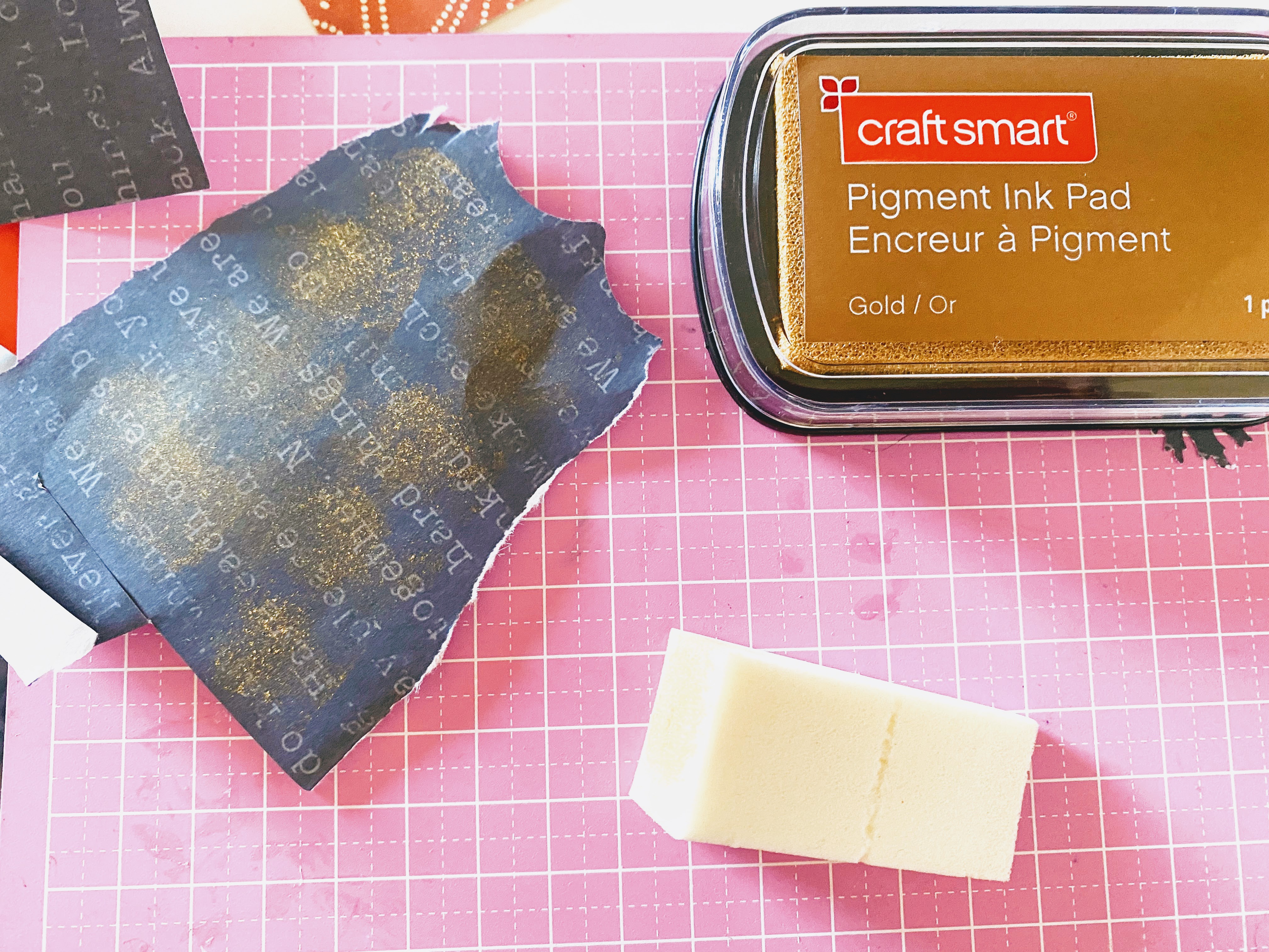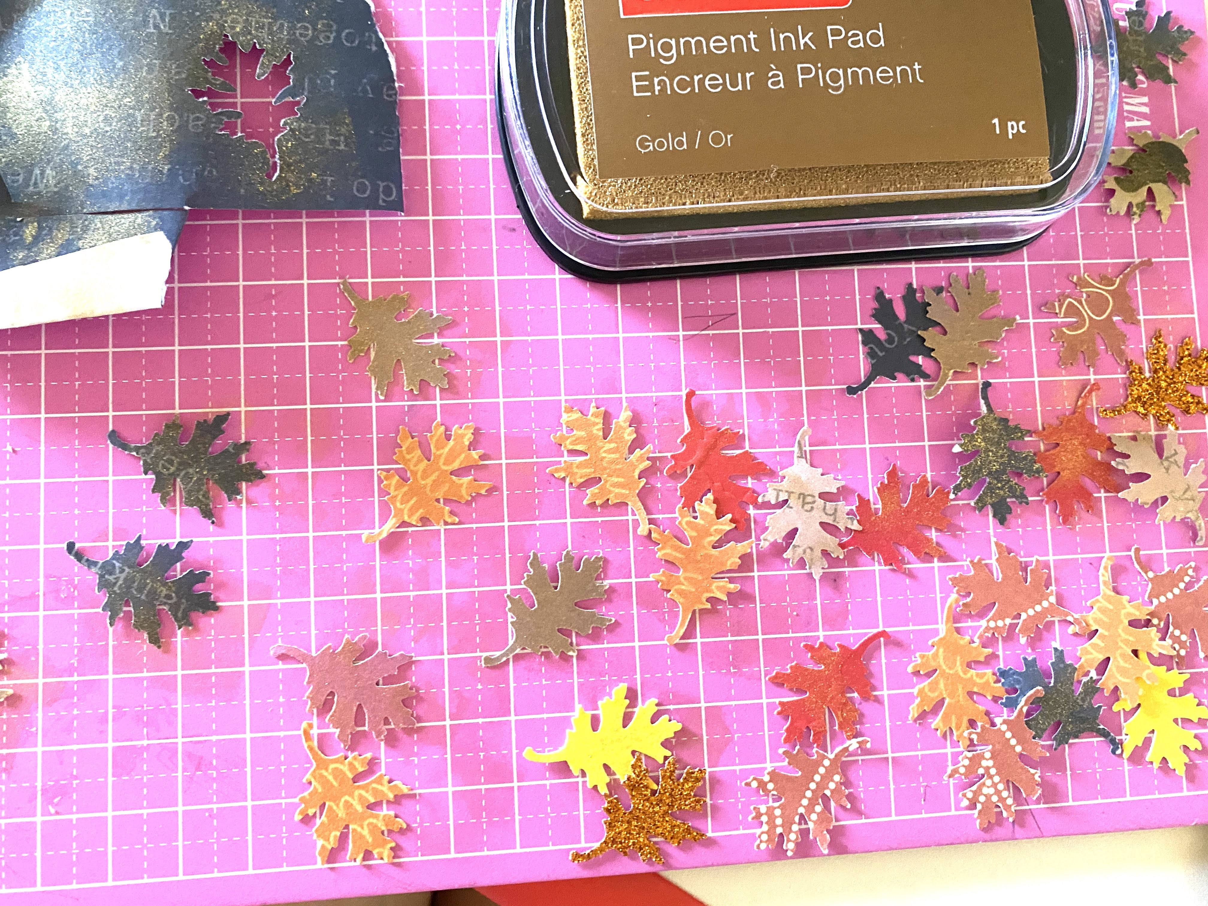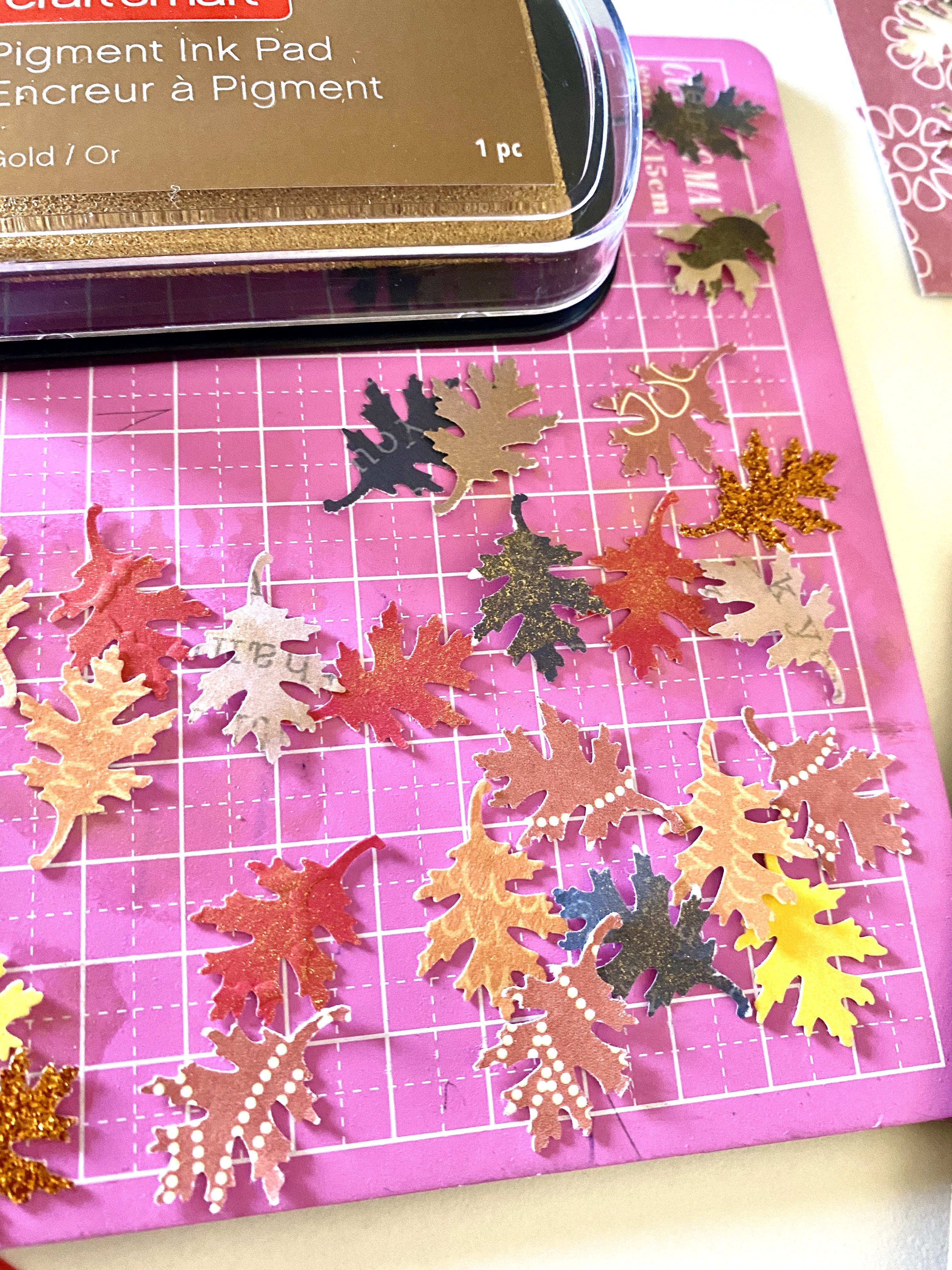 Step 5. This is the fun part. We decided to sponge gold ink on certain leaves (okay, almost all) to make it extra special. If you are crafting with kids, assign this task to them! Basically, we took a discount store makeup sponge and tapped it into CraftsMart’s Pigment Ink Pad in Gold. We sponged each leaf a few times. Doing so added a slight gold sheen to the leaves when light hit it from different angles. This subtle but elegant touch added some magic to the card.
