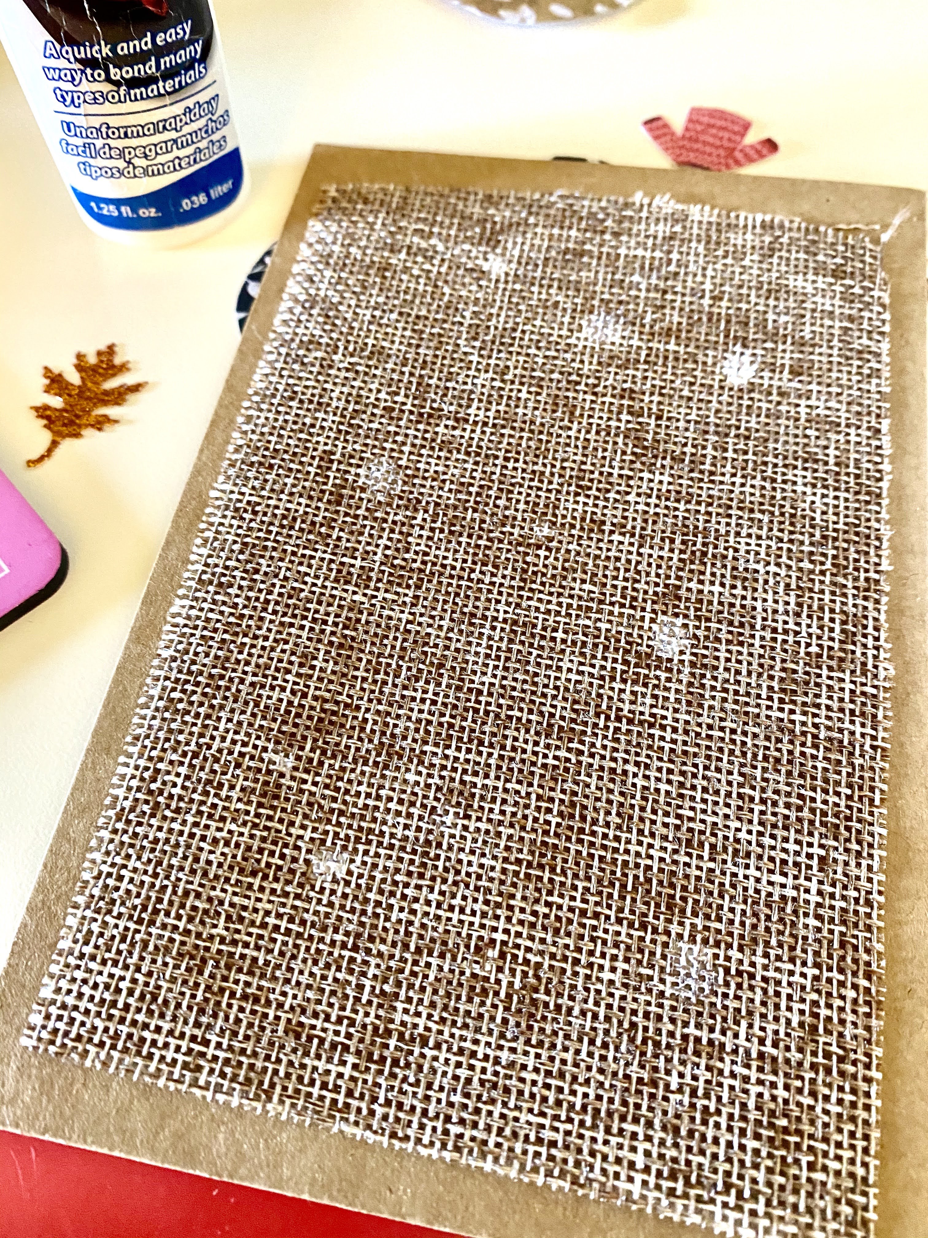 Step 2. Add a background. We chose burlap fabric because it looks rustic and brings warmth and texture to this project. Liz had this fabric for years and we have now been using the fabric roll in our projects.