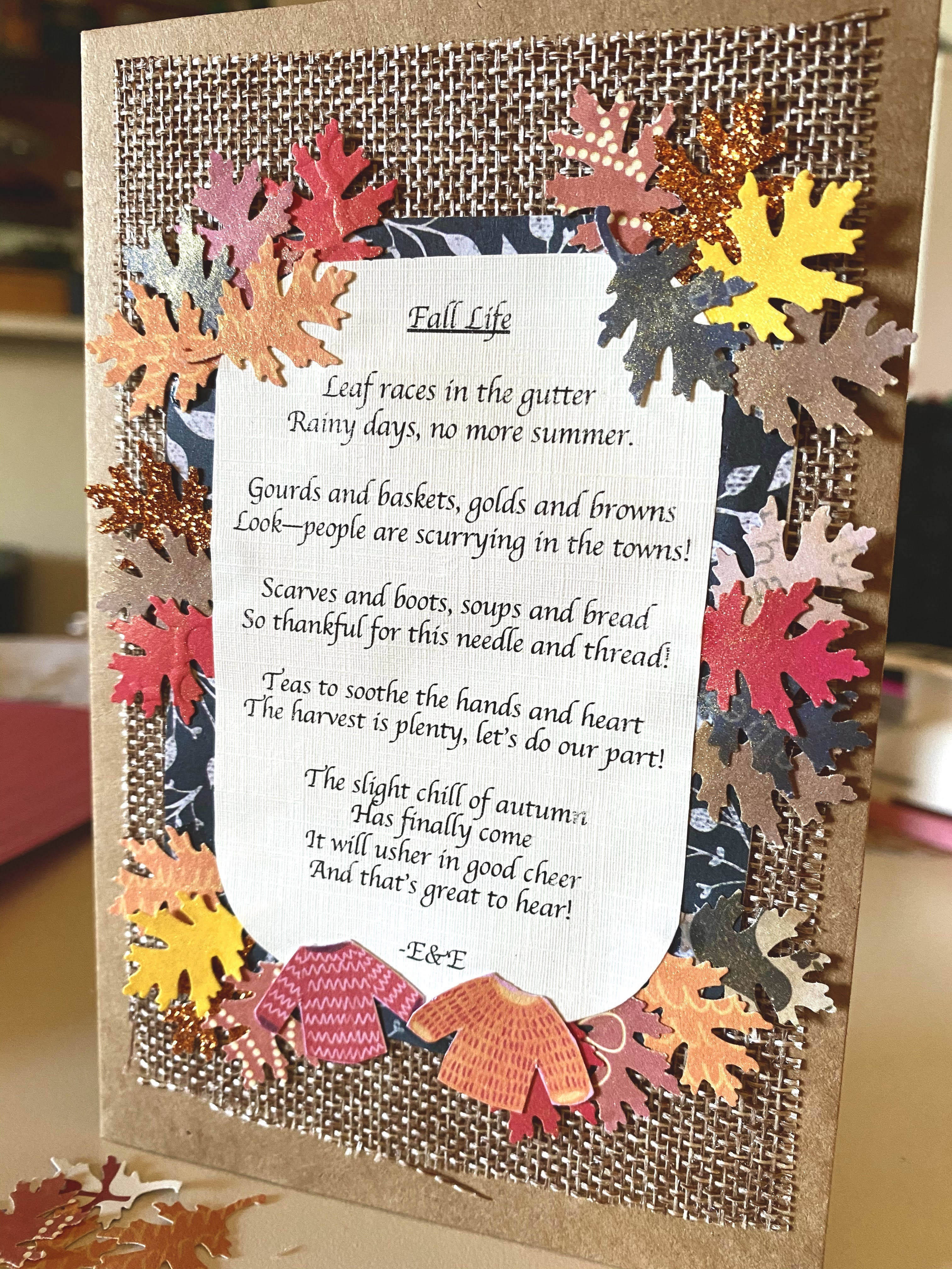 One thing is for sure. A poem makes for a great focal point on any card. Liz’s son loves poetry (thank you kindergarten, first and second grade teachers!). He helped Liz write an find rhyming words to this poem. He even gave it the title, “Fall Life”. After that, there was no turning back. We needed to put this on a card.