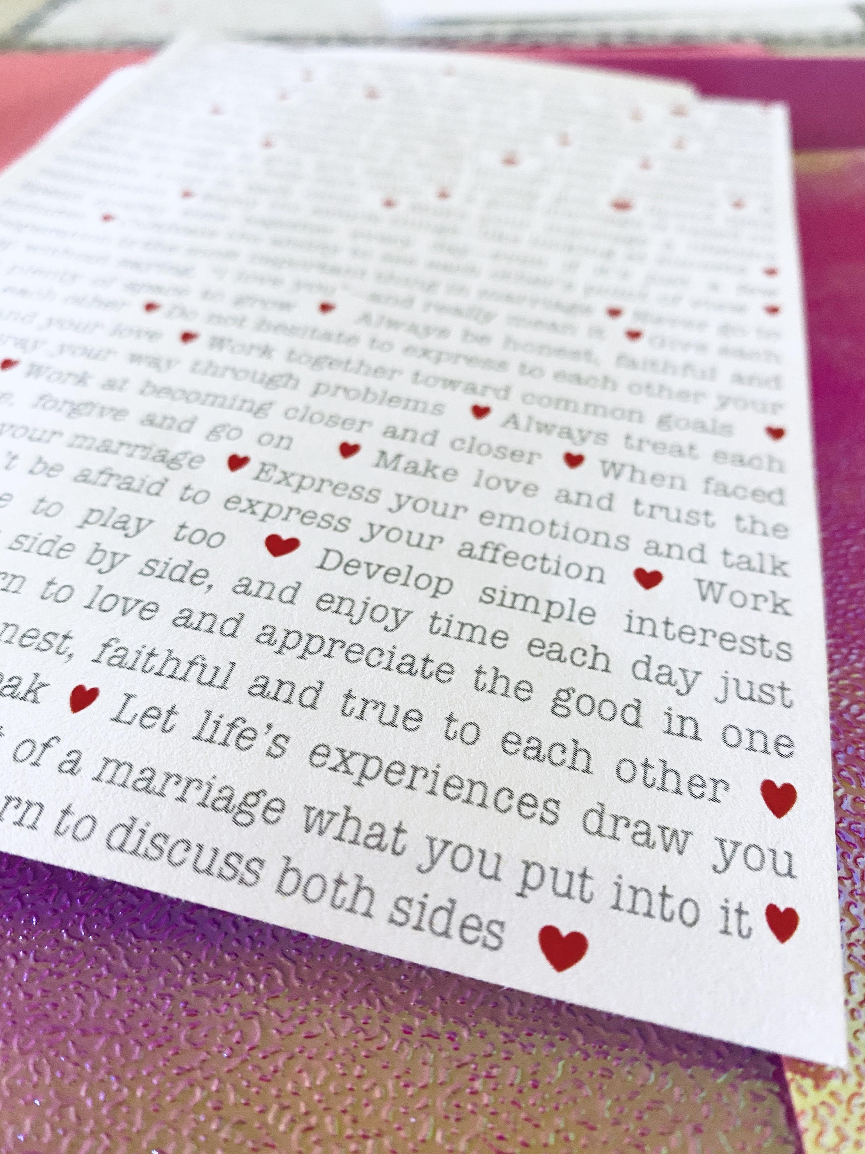 Liz decided she would type as many tips as possible and use the text as the card’s background. You can do this on any word processing program you own. Liz, in fact, used Microsoft PowerPoint so she can easily manipulate the text and images. Use any tool at your disposal (design software or not!) We used the “American Typewriter” font and lightened it to a charcoal gray. We also inserted tiny red hearts as spacing between each tip.