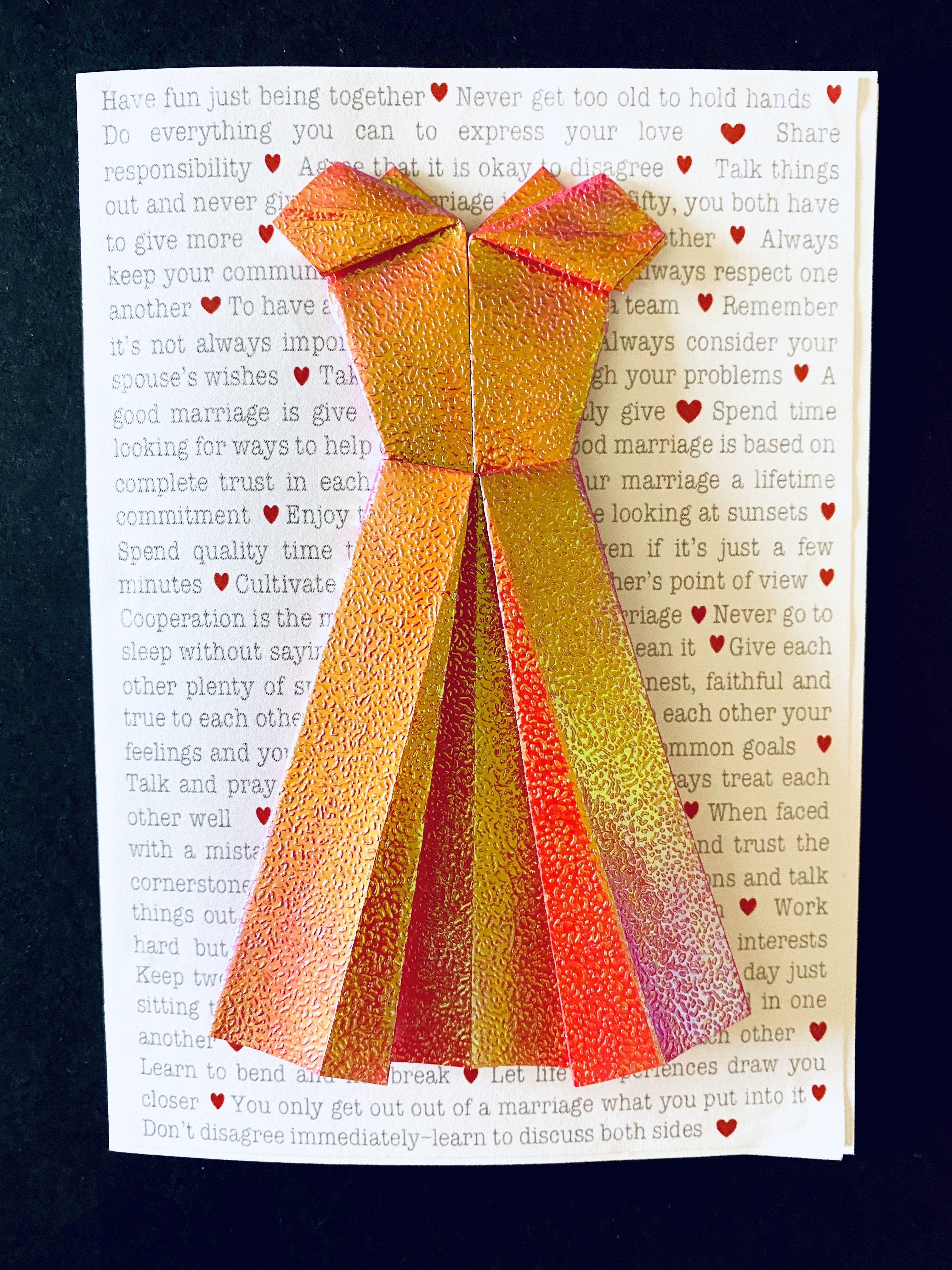 Next, we wanted to add a beautiful three-dimensional object as the centerpiece of the card. We also knew that we wanted to keep it simple. In the end, we chose to make an elegant dress using iridescent pink origami paper. When held to the light, it transforms and shimmers into golds and oranges. With its hues of pink, the paper looks like the perfect sunset.