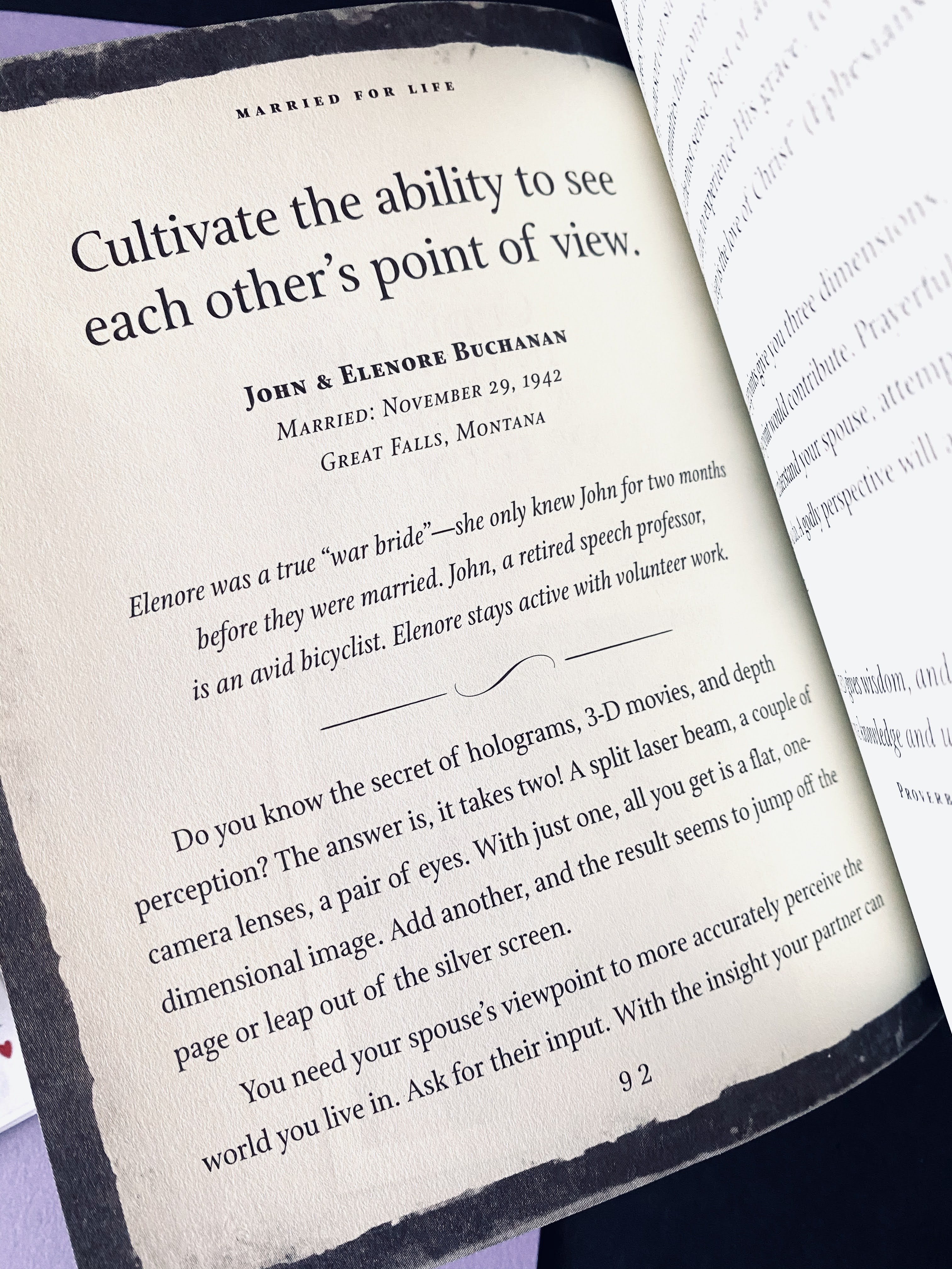 The first thing we did was open up the Hallmark book, Married for Life: Inspirations from those married for 50 years or more. We loved the advice from this book. It included both scripture from the bible but also your practical daily tips oh how to live and love your spouse.