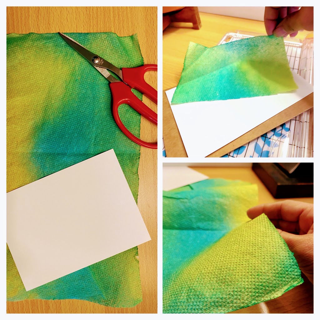 For our background today, we used dried paper towels that were dyed with Easter egg dye. We had these in our stash for a while. Since spring, really! In fact, Liz’s son used so many colorful dyes for his Easter eggs that she didn’t want to waste all that color. So we decided to use the leftover dye to soak paper towel sheets. We let it air dry outside. For that week, we had a string of beautiful and colorful flags on our balcony.
