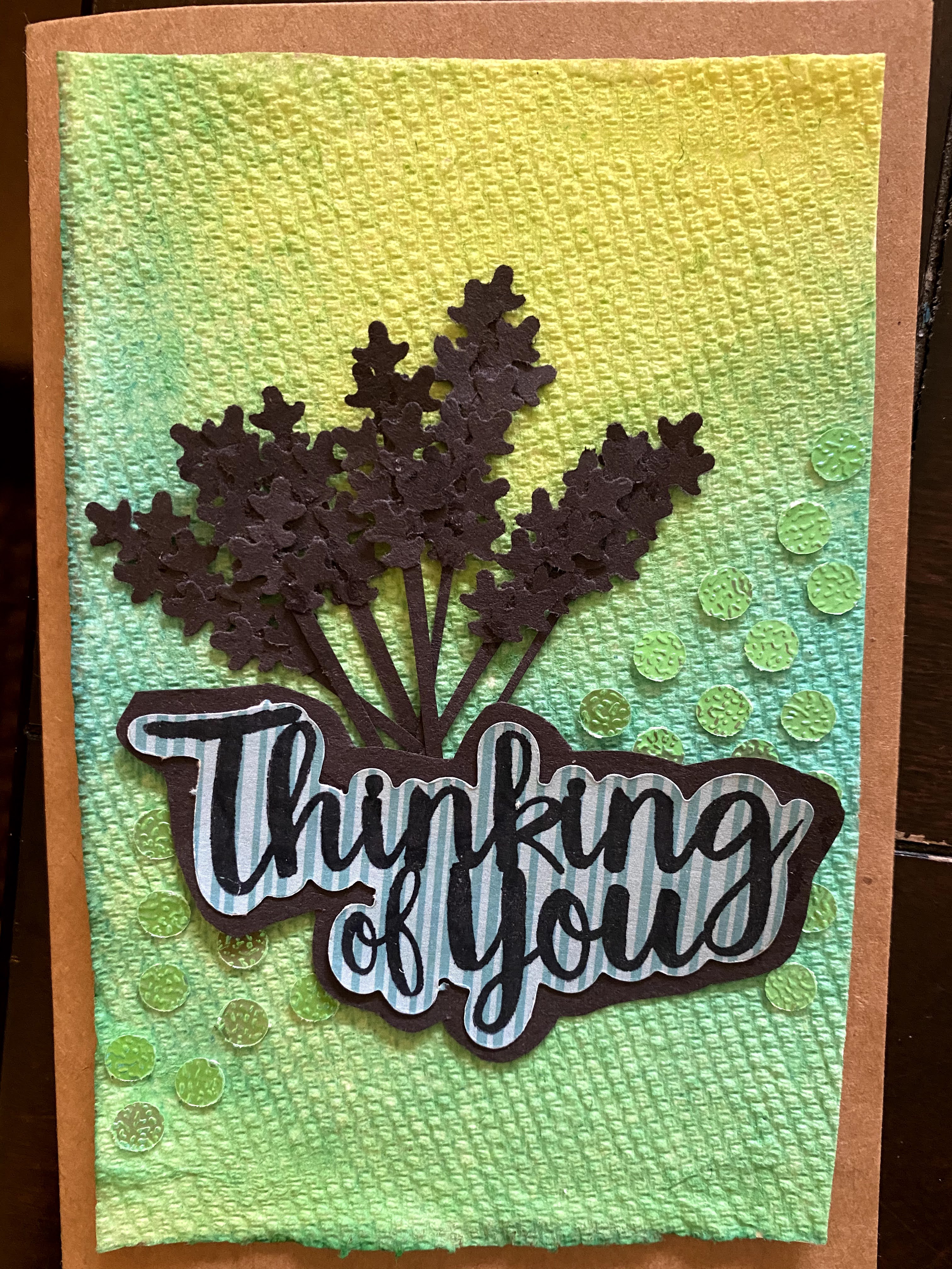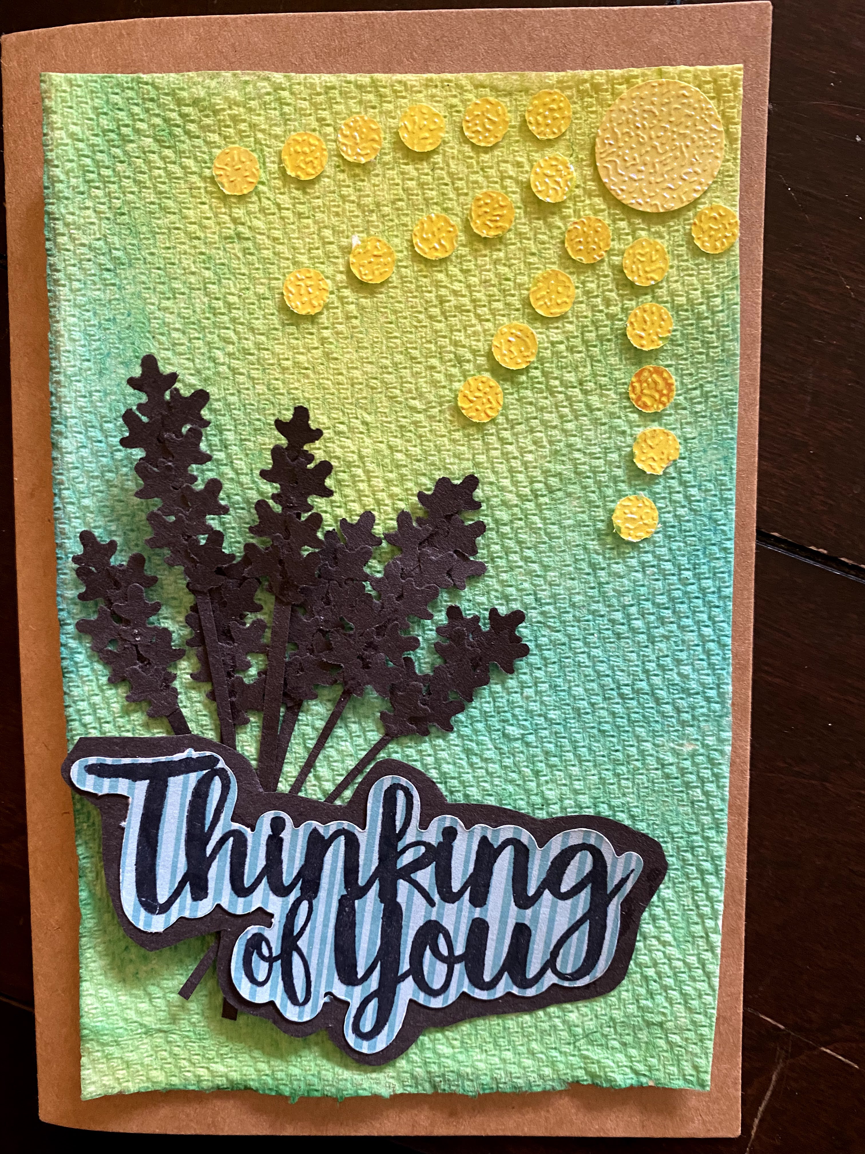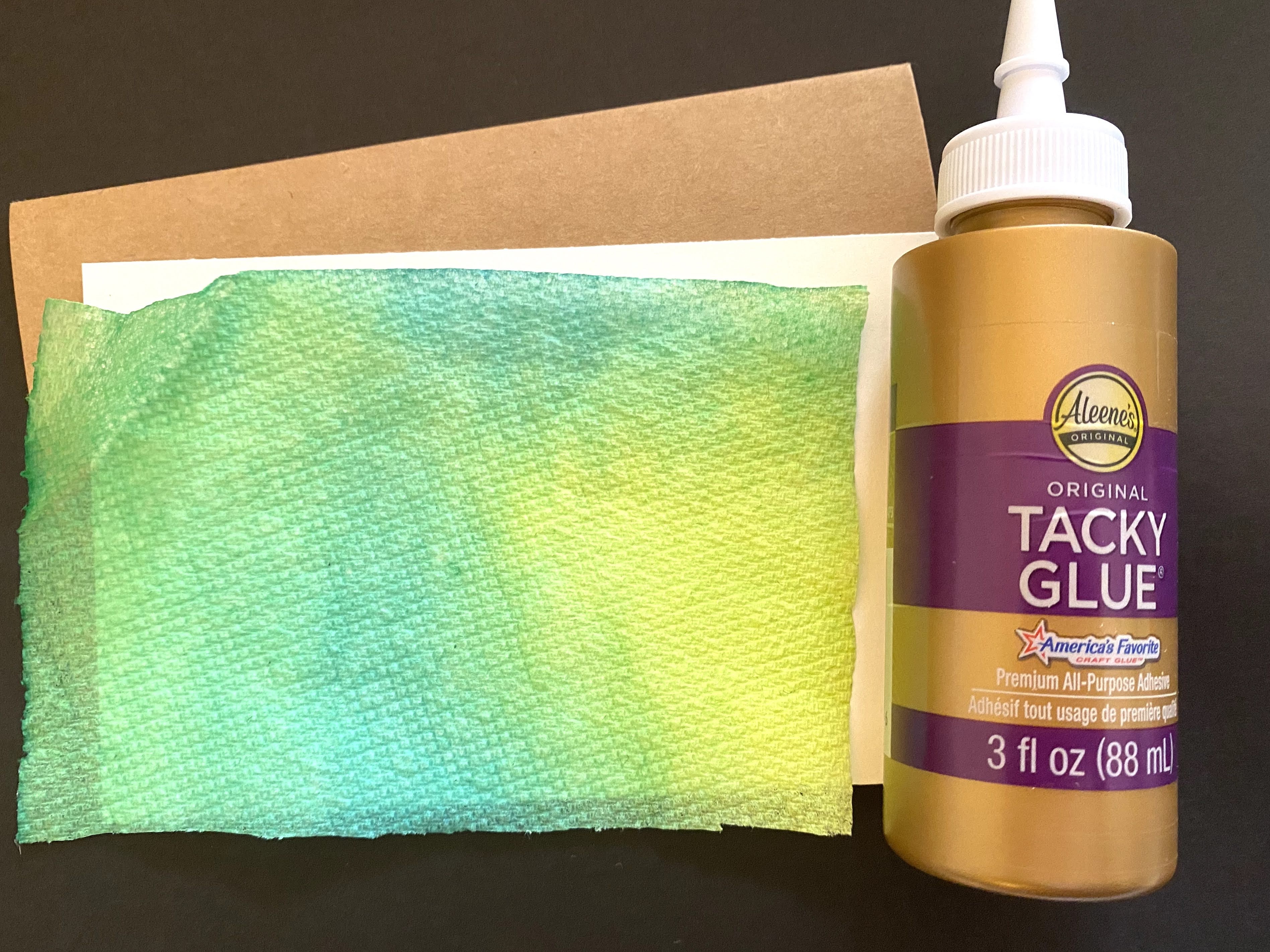 Fast forward to another day of crafting. We chose a paper towel with blue, greens and yellows all blended throughout. We did not want to use a purple background, but something contrasting to our silhouette. We then cut the edges so that it fit a small off-white cardstock. Attaching a colorful and thin layer to a lighter background will help it “pop” and stand out since the greeting card we used today was an A6 size brown card.