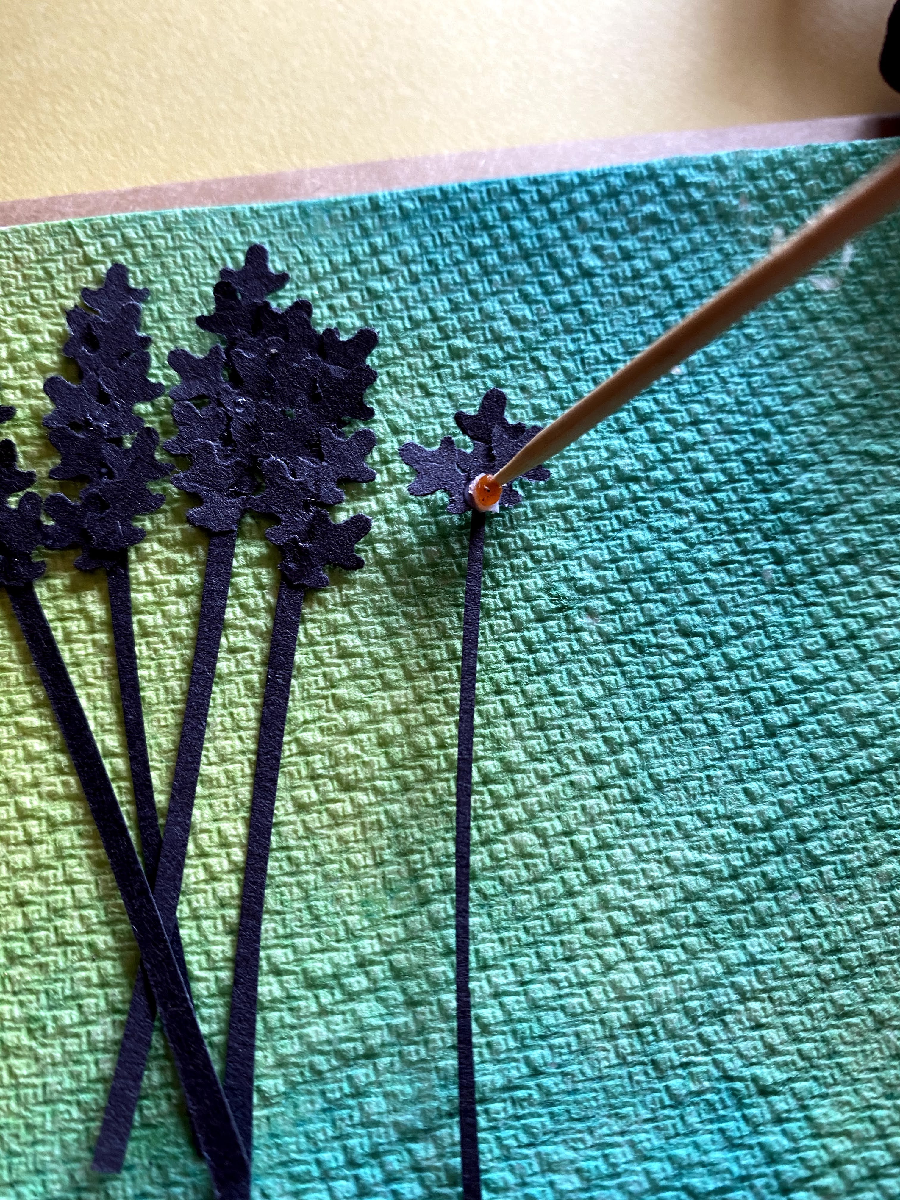 Here we used a small snowflake paper punch. We are always finding new ways to stretch or uniquely use our paper punches. You can punch snowflakes on black paper and then just cut off the tips. The tips look like small little flowers. Next, we cut small thin strips of black construction paper. Using a toothpick we carefully picked up and glued pieces of our snowflake tips to our stems. Tip: We found a bottle of Aleene’s Tacky Glue in the dollar Tree. It seemed to be the perfect product for glue here because it dries clear and does not leave as much residue as a regular Elmer’s glue. The result? A dainty and beautiful silhouette replica of a lavender bouquet.