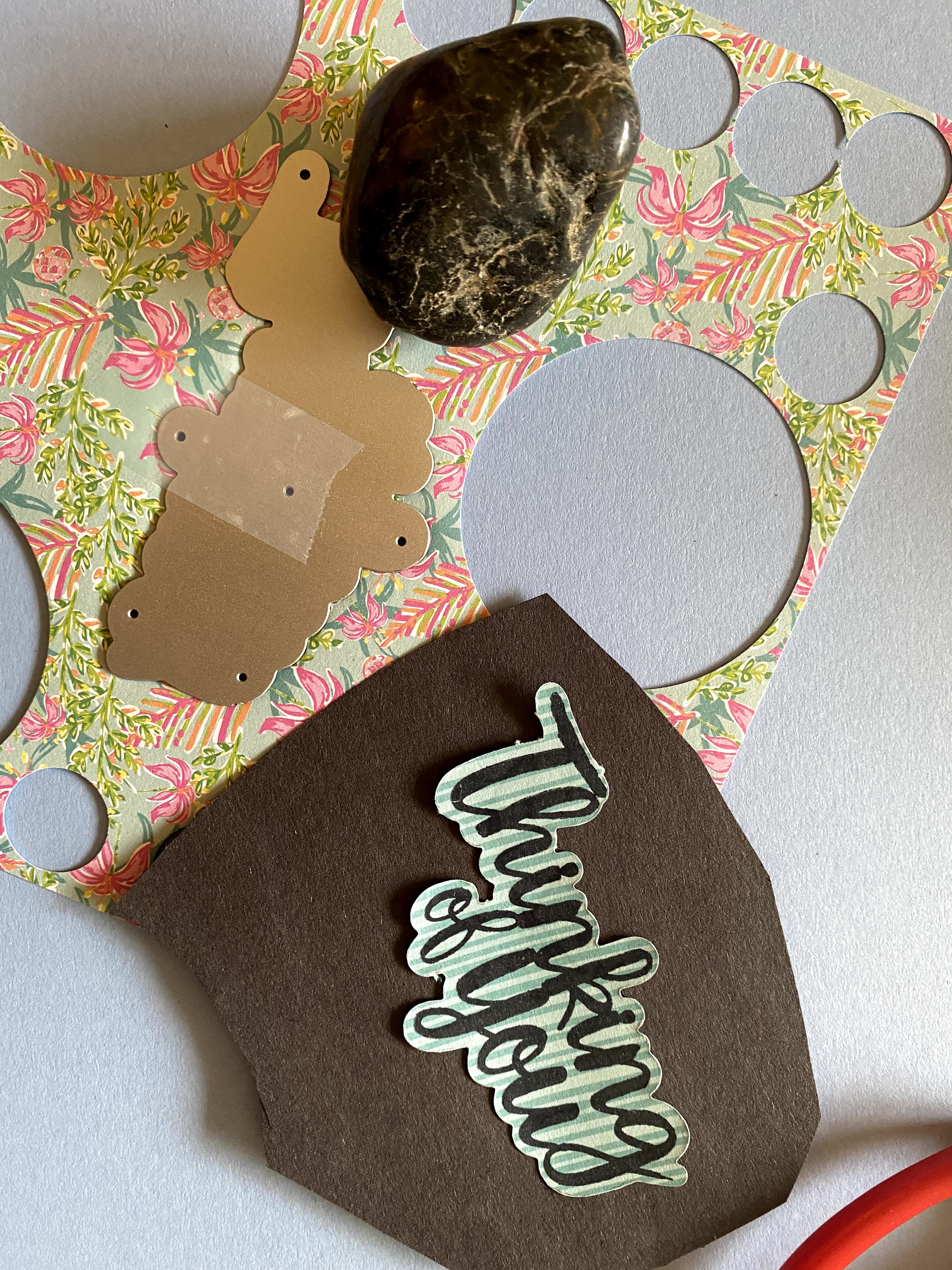 Next, we stamped a “Thinking of You” sentiment on some mellow blue striped paper. We bought this at a Michael’s store a month or two ago. I think it was part of a Recollections set. Anyways, we do not yet have an embosser or die cutting machine (Yes, hopefully one day!) We just hacked our way by taping our metal die to a decorative paper and firmly pressing around the edges of it with a stone. We got it done in less than 10 minutes (And….. we decided that we just may wait until we get a die cutting machine next time, haha!)