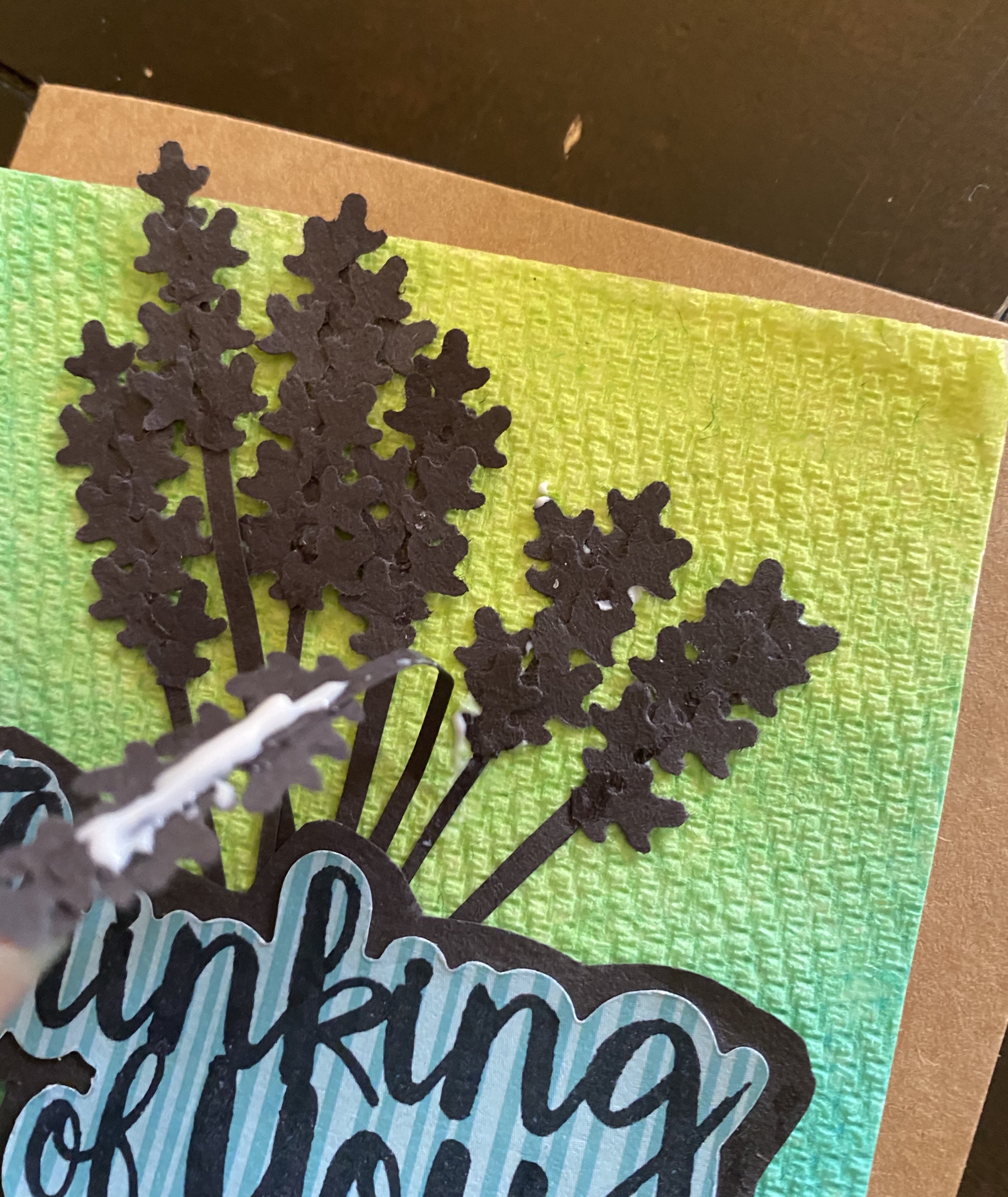 Next, we arranged our silhouette of lavender behind our sentiment. We glued the sentiment down in the center of the card. We did, however, temporarily leave the edges unglued. Next, we glued down the arrangement. For a few stalks, we let the lavender tips slightly fall past the edge of our colorful background to just give it a feel of three dimension–as if the bouquet was growing beyond the card.
